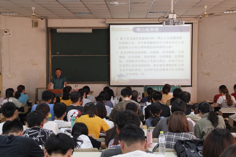 薛乔升通过中国每年蛇伤患者人数和蛇伤病死率、致残率等数据,向同学们强调了毒蛇咬伤的危险性,介绍了如何根据蛇的颜色、花纹、毒牙、体型等九个方面区分毒蛇与无毒蛇。薛乔升强调蛇咬伤的预防是重中之重,对同学们前往实习的崂山地区的蛇类分布情况进行了重点介绍。他结合多年就诊经验从防止毒液扩散吸收、促进蛇毒的排出及破坏、抑制毒液作用三个方面向同学们详细讲解了毒蛇咬伤的现场急救方法。