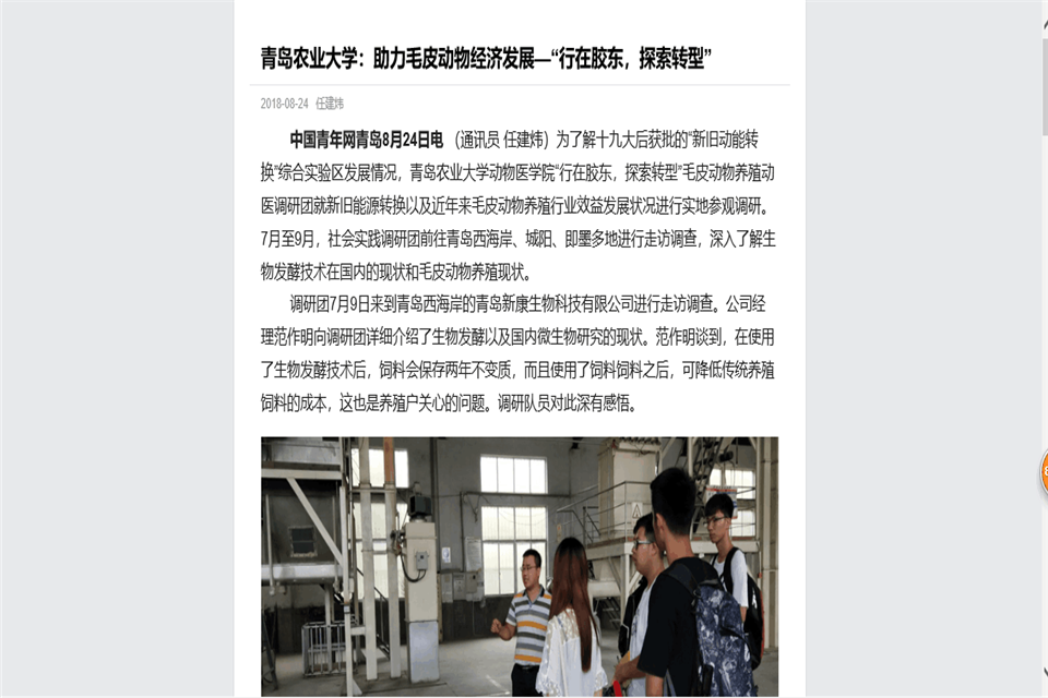 调研团7月9日来到青岛西海岸的青岛新康生物科技有限公司进行走访调查。公司经理范作明向调研团详细介绍了生物发酵以及国内微生物研究的现状。范作明谈到,在使用了生物发酵技术后,饲料会保存两年不变质,而且使用了饲料饲料之后,可降低传统养殖饲料的成本,这也是养殖户关心的问题。调研队员对此深有感悟。