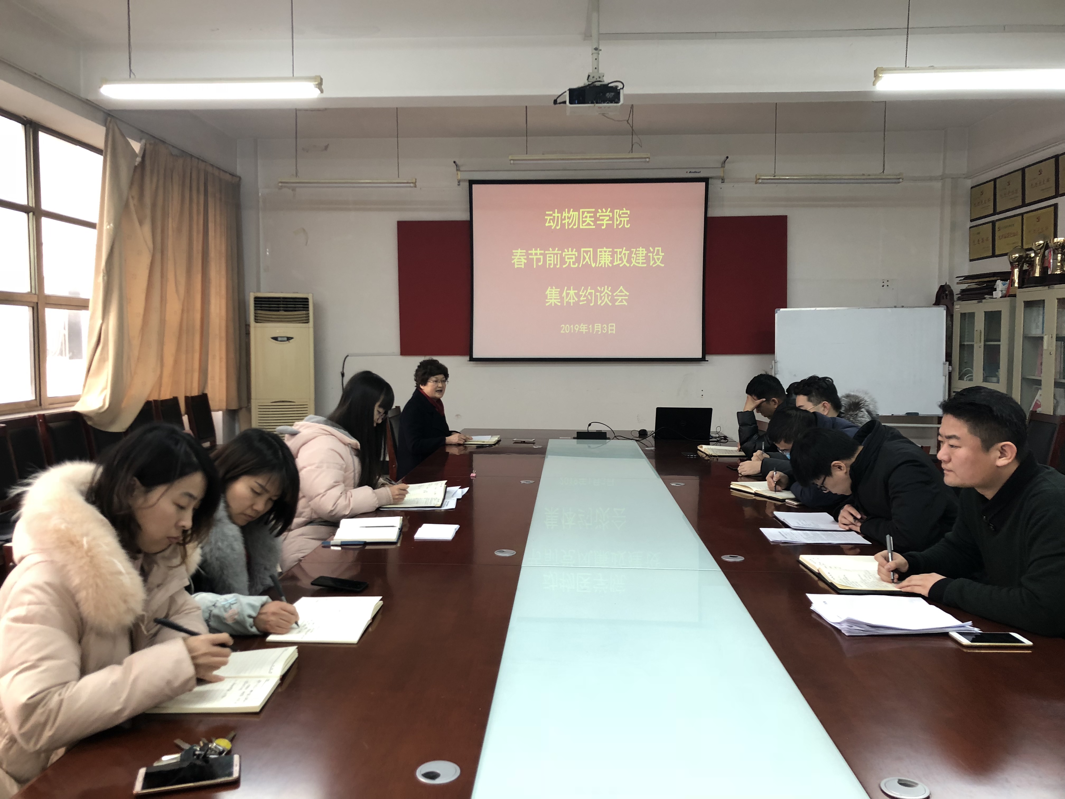1月3日,青岛农业大学动物医学院于生物楼C召开春节前党风廉政建设集体约谈会,对学院党政领导班子成员、各支部委员、教研室主任及学院办公室、学工办成员进行集体约谈。约谈会由学院党总支书记孙运彩主持。