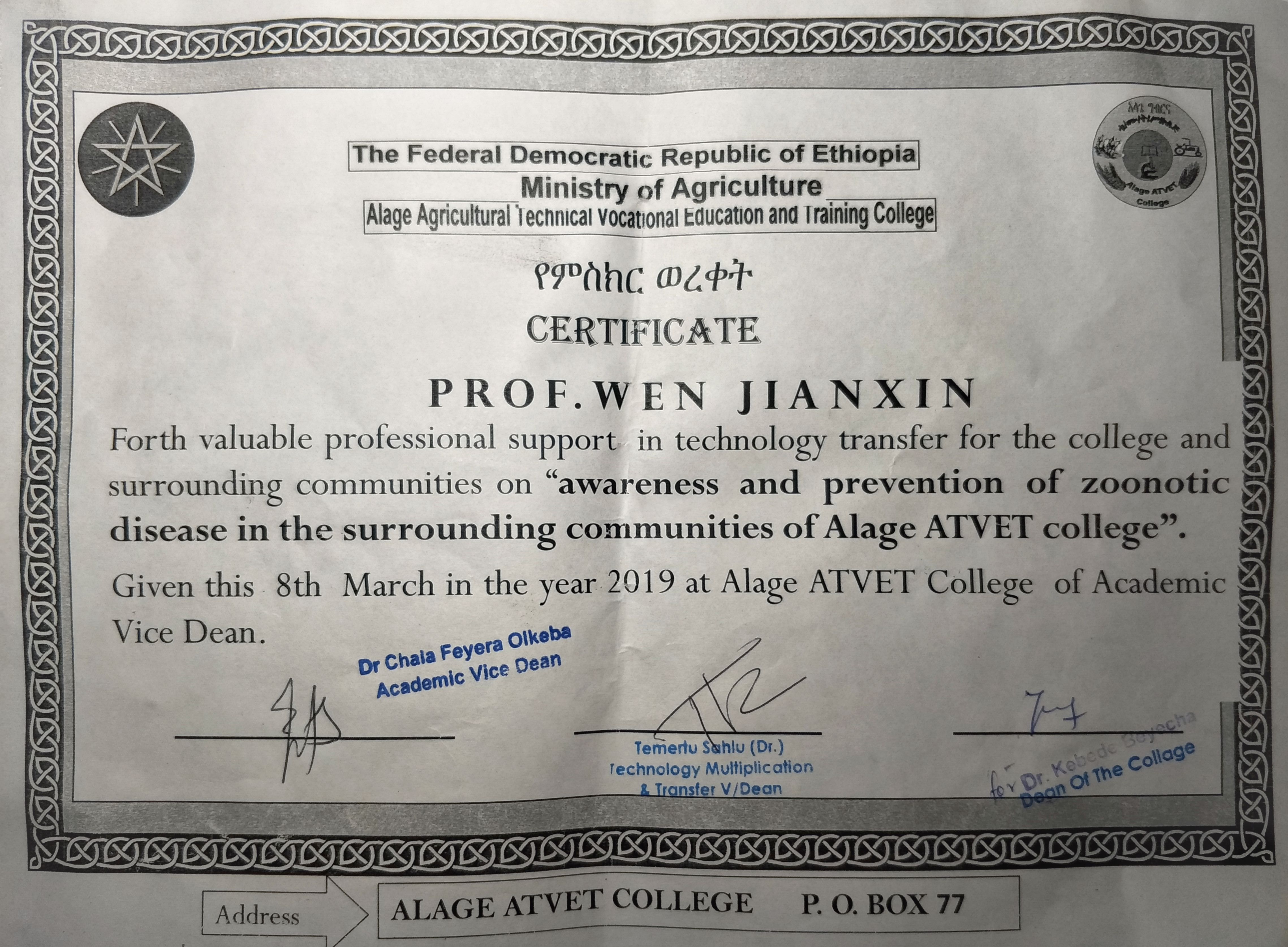 温建新老师前往埃塞俄比亚ALGAE学院工作的8个月里,成绩十分显著,赢得广泛好评。他不畏艰辛,努力工作,得到当地教师和学生们的感谢和称赞,当地的农业部和联邦政府以及ALGAE学院特此颁发荣誉证书以表示对温建新老师工作的认可和高度评价。