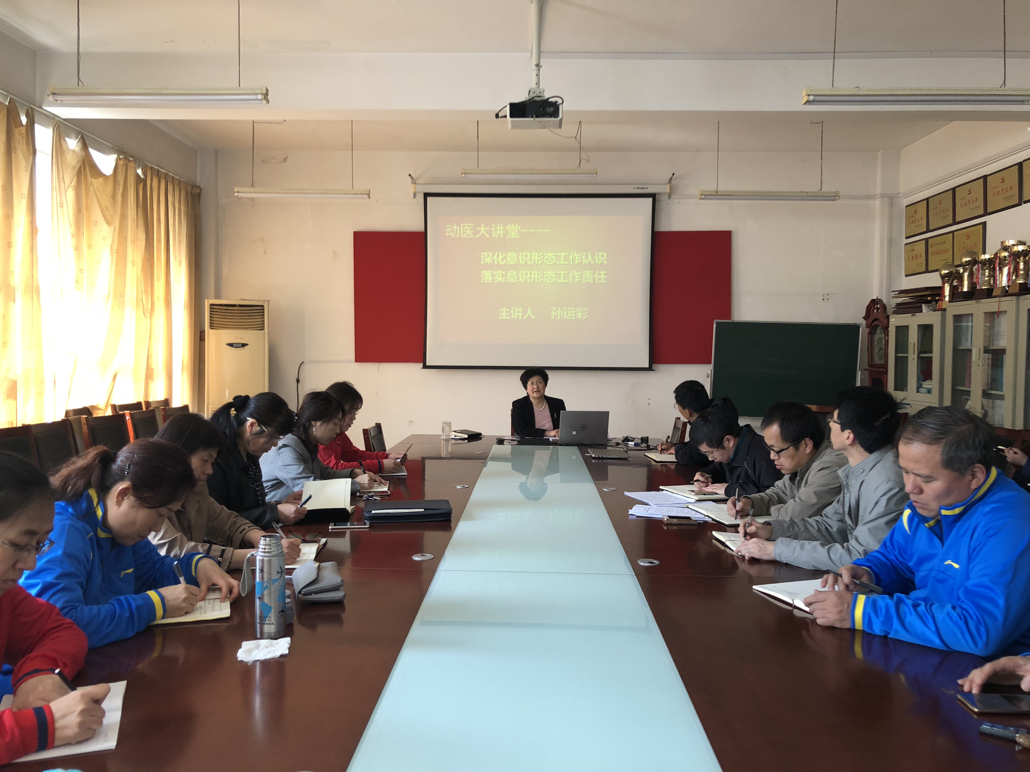 4月18日,动物医学院举办本学期第四期动医大讲堂,由学院党总支书记孙运彩为全体教工做意识形态专题报告,学院全体教职工参加。