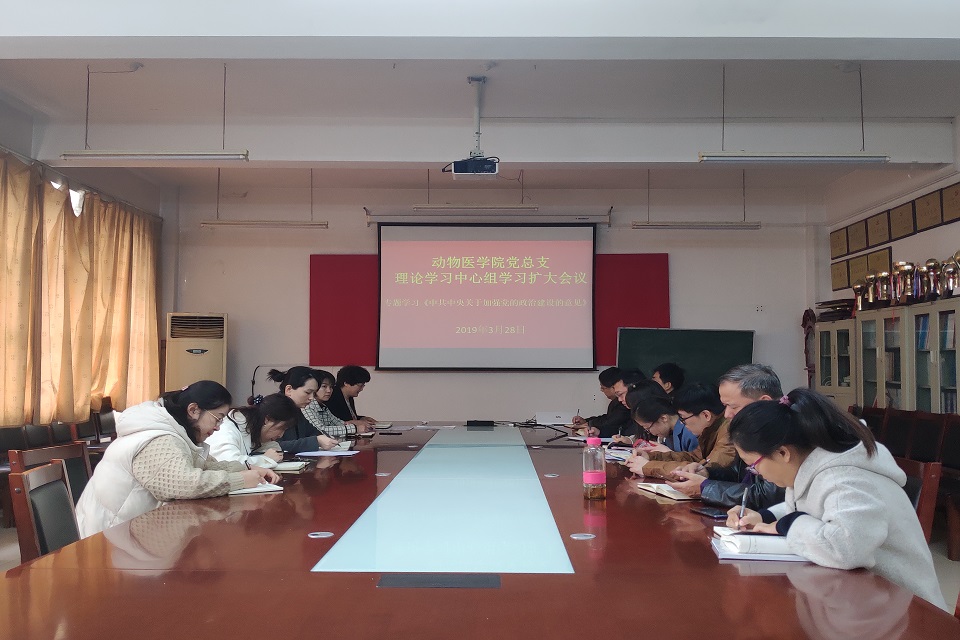 3月28日,动物医学院召开党总支理论学习中心组学习扩大会议专题学习《中共中央关于加强党的政治建设的意见》,会议由动物医学院党总支书记孙运彩主持,党总支理论学习中心组成员、各支部委员、科级干部参加学习。
