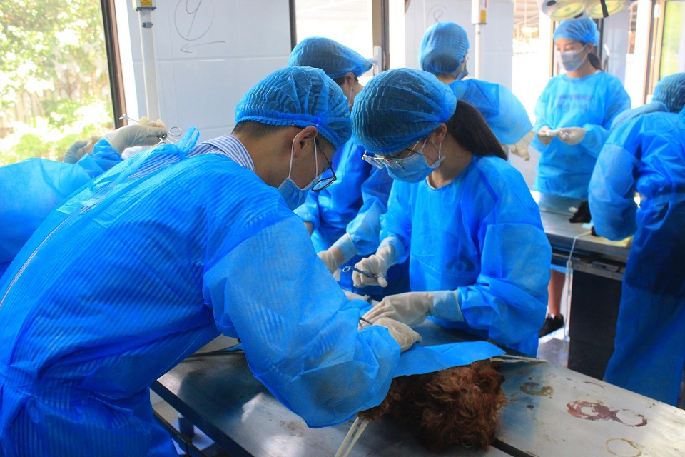经过报名与考核,筛选出68名同学,组成17个竞赛团队参加比赛。比赛内容有术前手术计划制定和犬胃切开与缝合、膀胱切开与缝合、雌性犬类绝育三种临床常用手术。各组比赛内容经抽签决定,比赛分两场进行。比赛过程中主刀选手和助手配合默契,他们从每一个细节入手尽可能的规范手术操作。