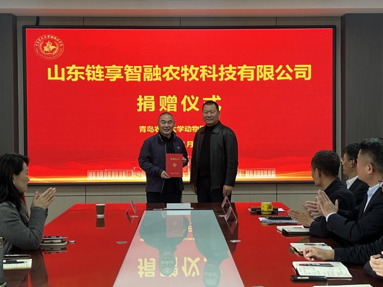 11月13日下午,山东链享智融农牧科技有限公司捐赠仪式在青岛农业大学动物医学院会议室举行。