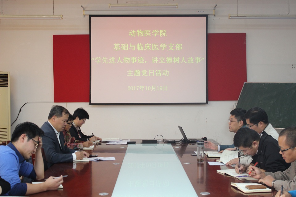 为引导广大教职工更好地立足岗位、履职尽责,进一步强化立德树人意识,提升师德师风建设,庆祝党的十九大胜利召开,10月19日,动物医学院第一党支部全体党员和基础、临床医学两个教研室的非党员教工,在党支部书记曹荣峰主持下于生物楼C205开展了"学先进人物事迹、讲立德树人故事"的主题活动。