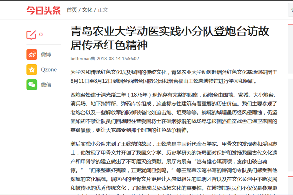 为学习和传承红色文化以及我国的传统文化,青岛农业大学动医赴烟台红色文化基地调研团于8月11日至8月12日到烟台西炮台国防公园和烟台福山王懿荣博物馆进行学习和调研。