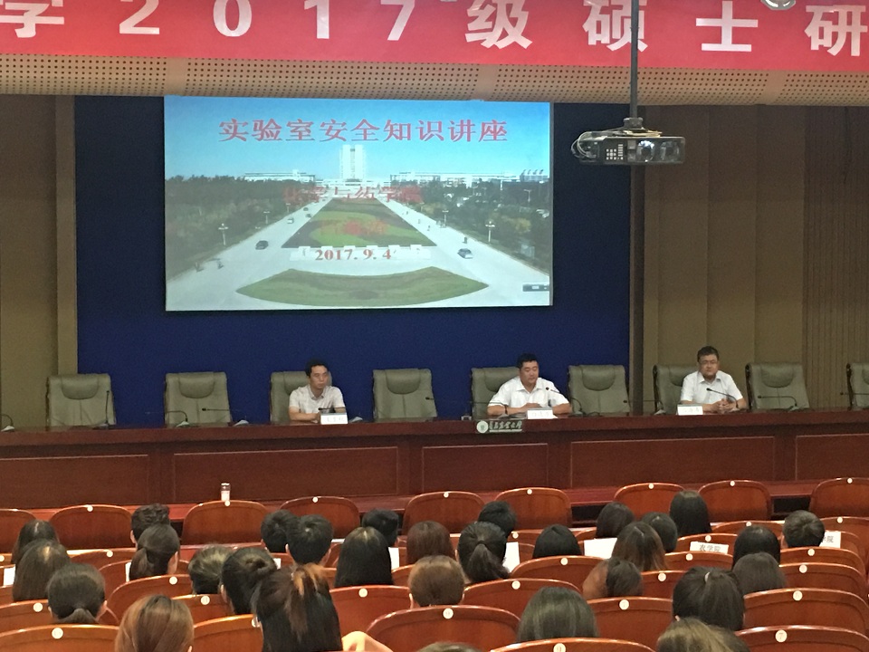 学院组织全体研究生新生参加了研究生入学典礼,并听取了化学与药学院副院长吕海涛主讲的化学安全知识报告和机电学院教师王至秋主讲的实验室用电安全知识和通风柜使用的相关知识报告。
