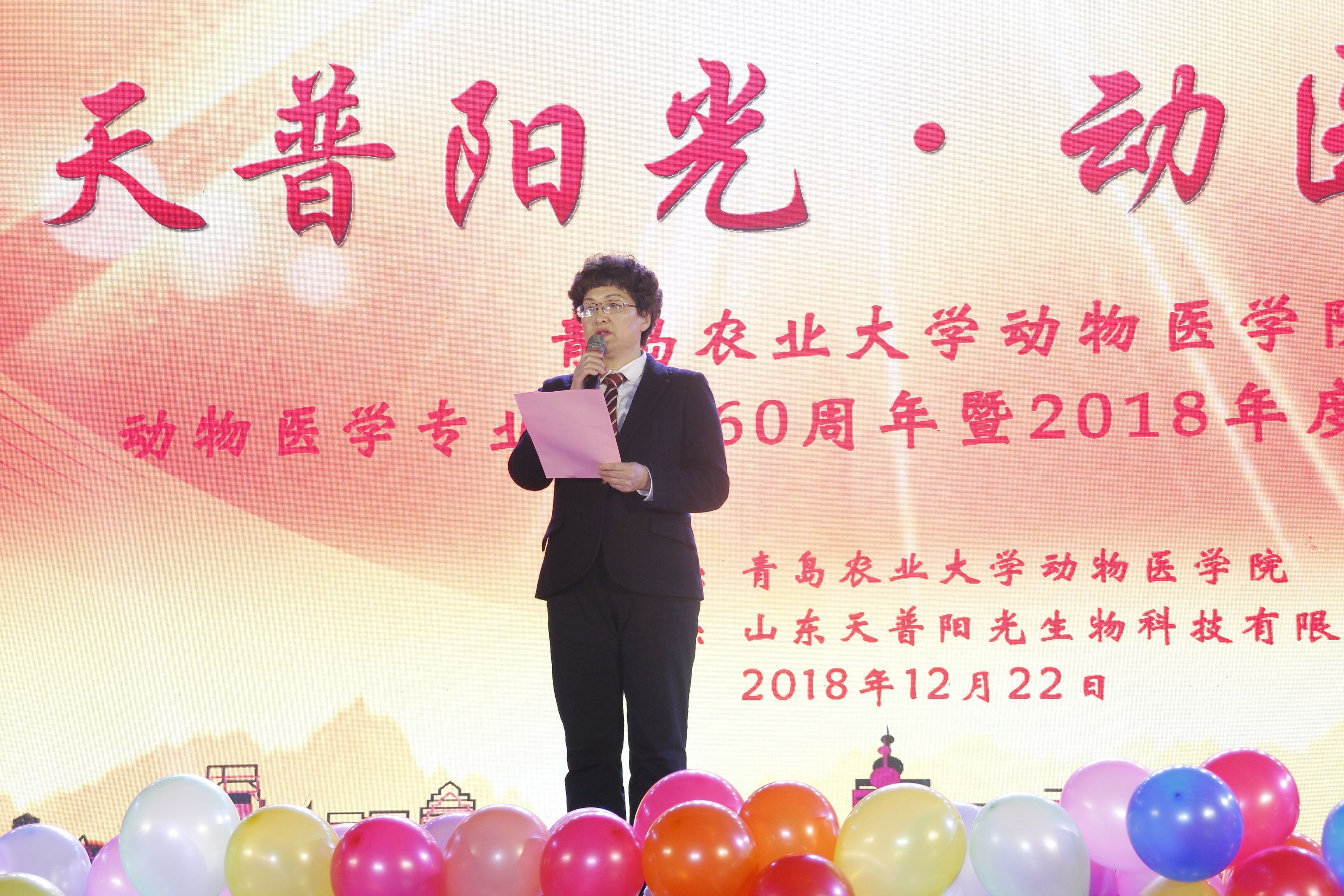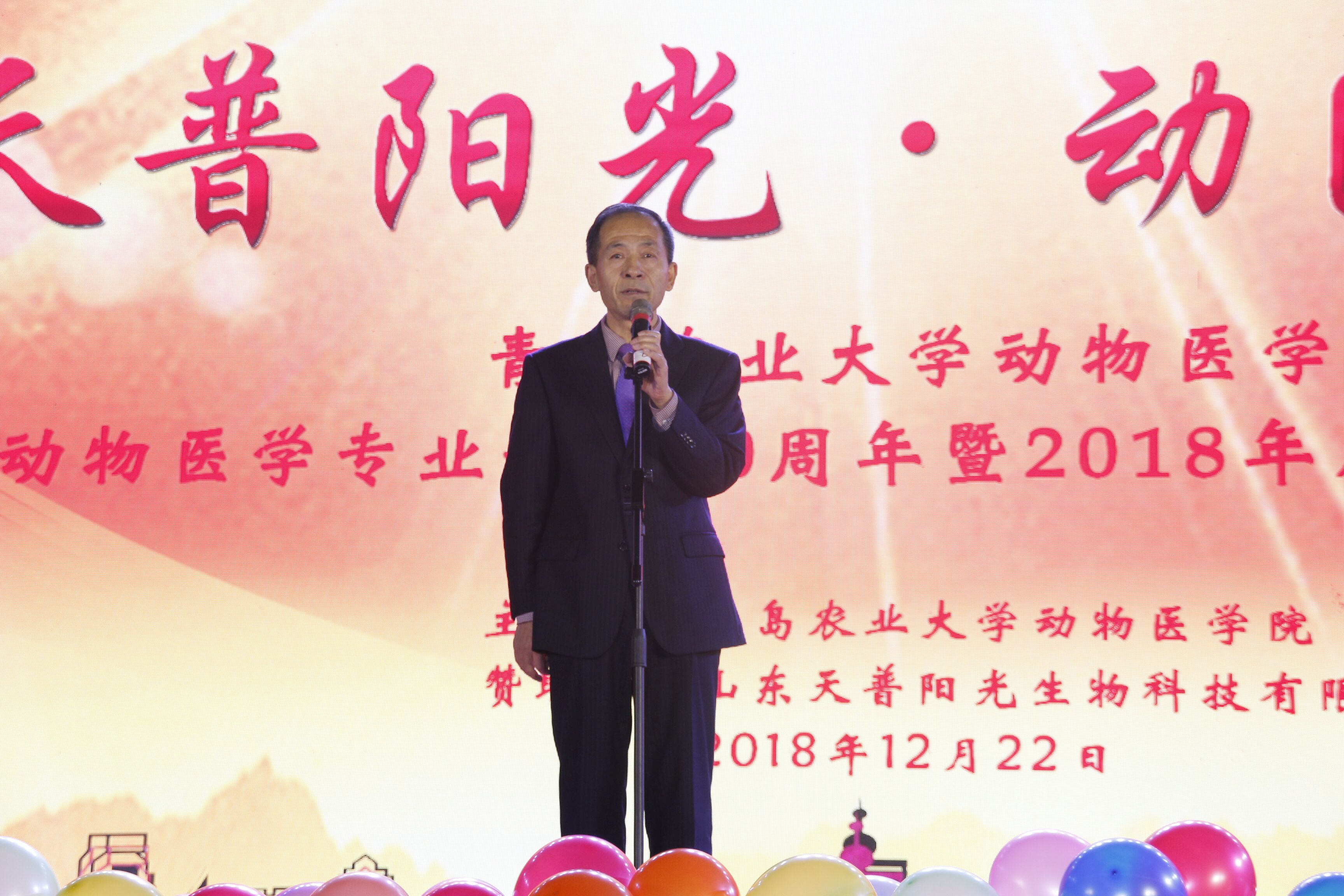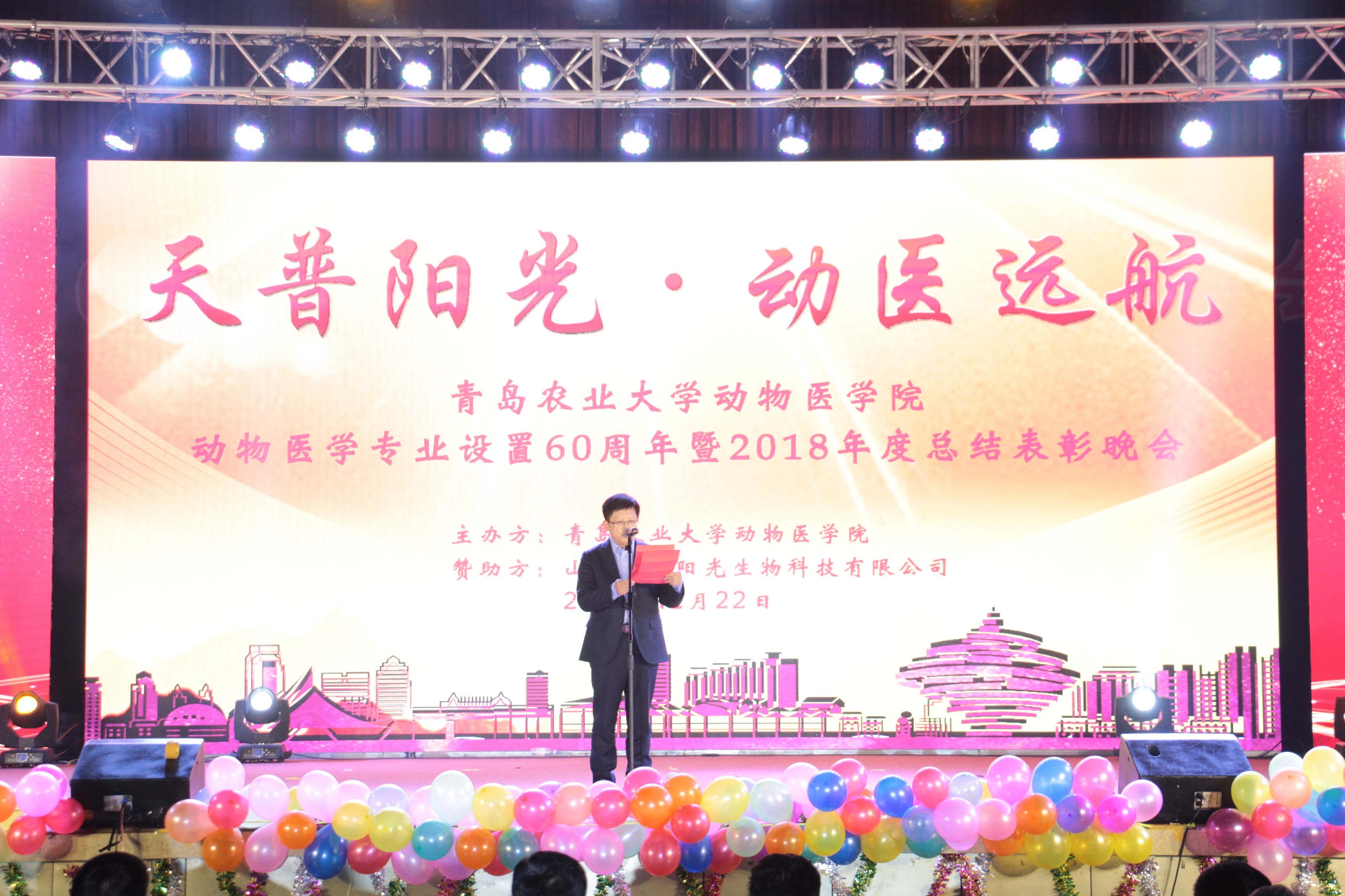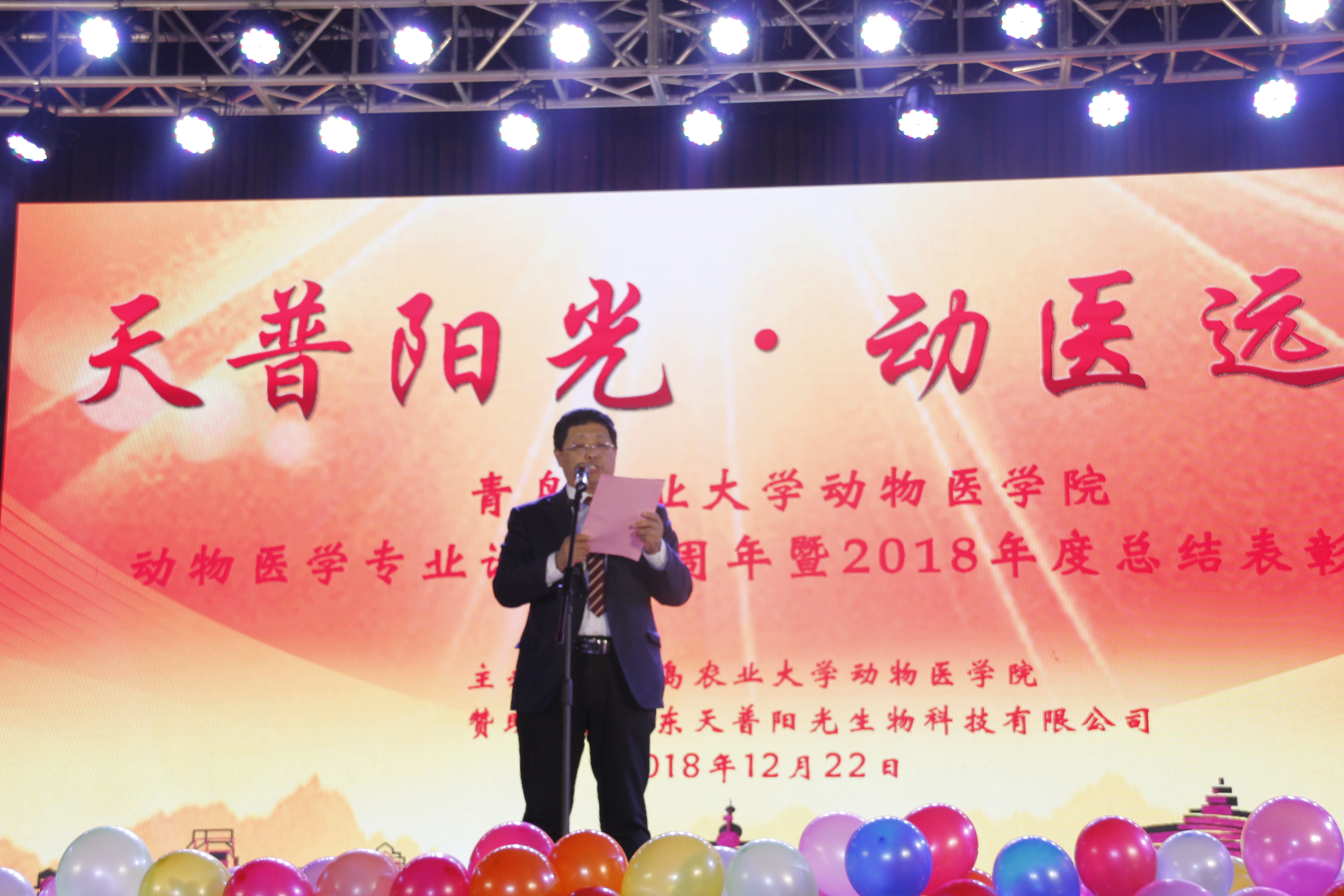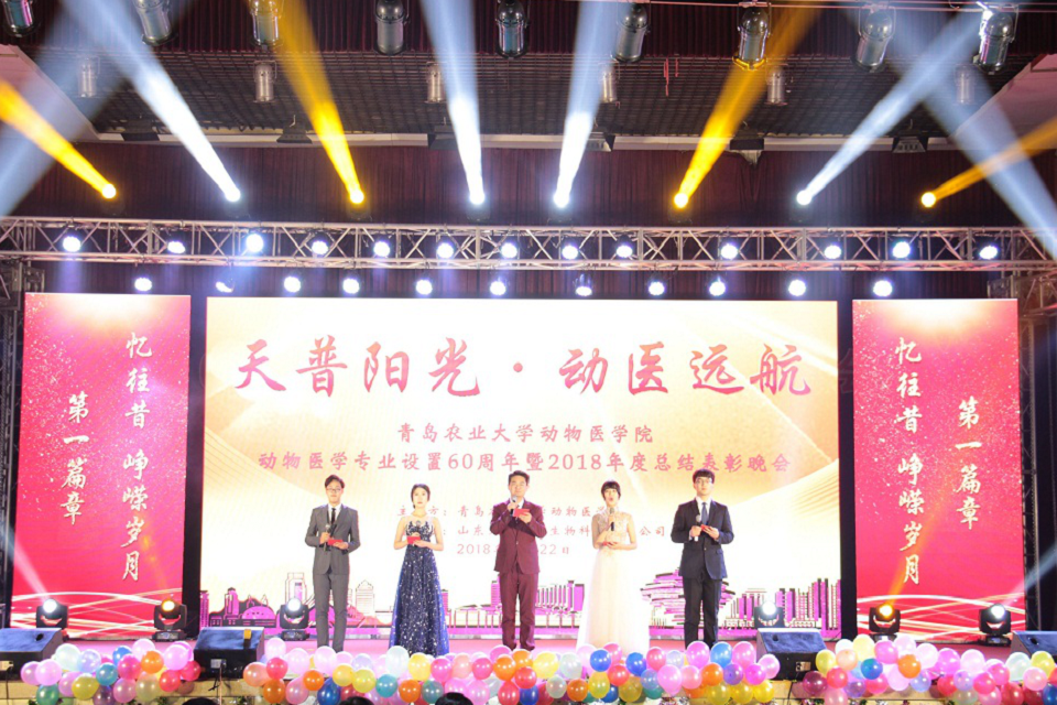 12月22日,“天普阳光,动医远航”—青岛农业大学动物医学院动物医学专业设置60周年暨2018年度总结表彰晚会在文体馆隆重上演。青岛农业大学校党委副书记王庆军、青岛农业大学副校长原永兵、青岛农业大学副校长朱连勤、晚会赞助单位山东天普阳光生物科技有限公司董事长、总裁史效华先生、动物医学院老教师、校友、企事业单位代表等50余名嘉宾共同出席,学校相关部门领导、学院领导班子及全院师生参加。