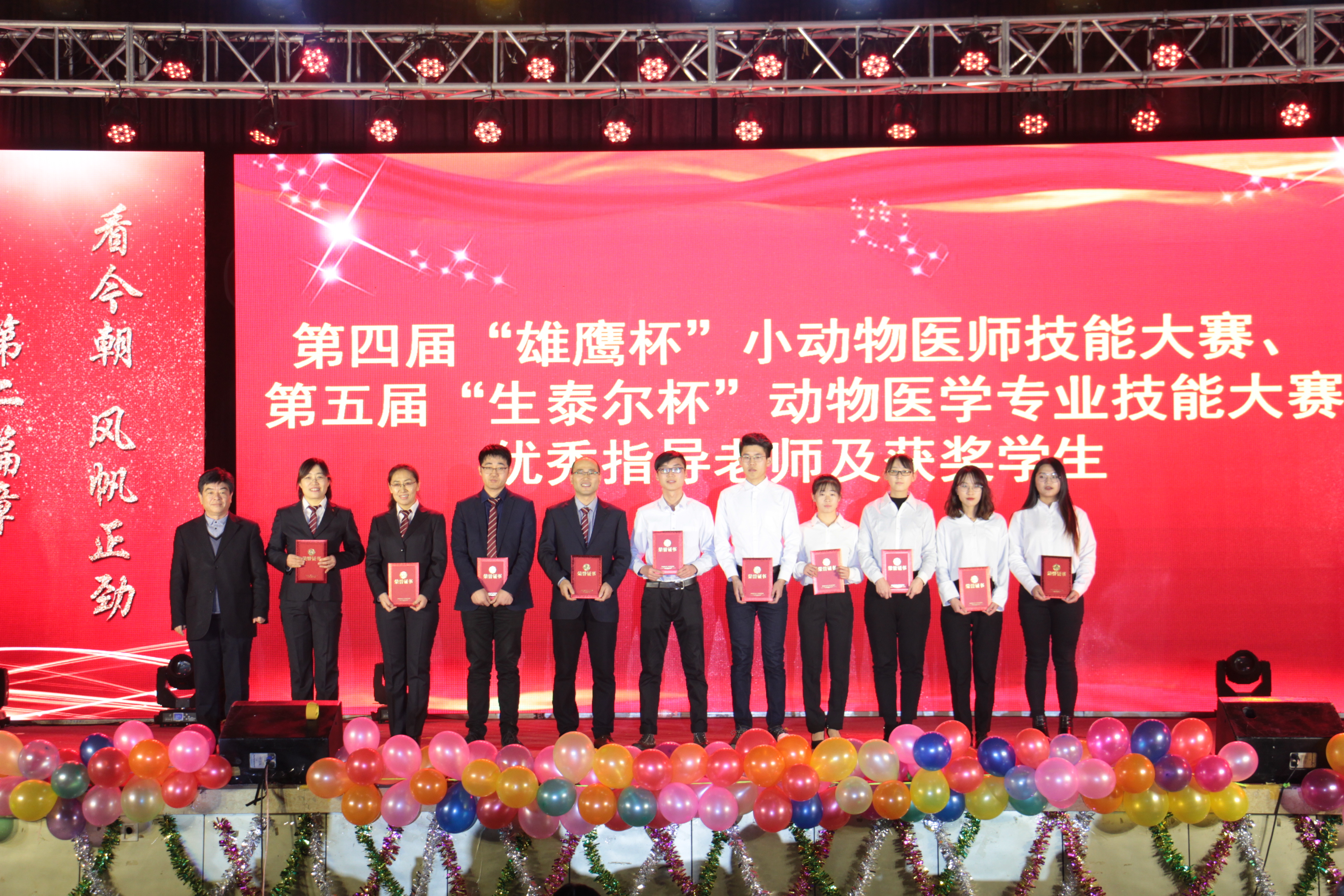 教务处处长田义轲为“雄鹰杯”小动物医师技能大赛、“生泰尔杯”动物医学专业技能大赛优秀指导教师、获奖学生颁奖。