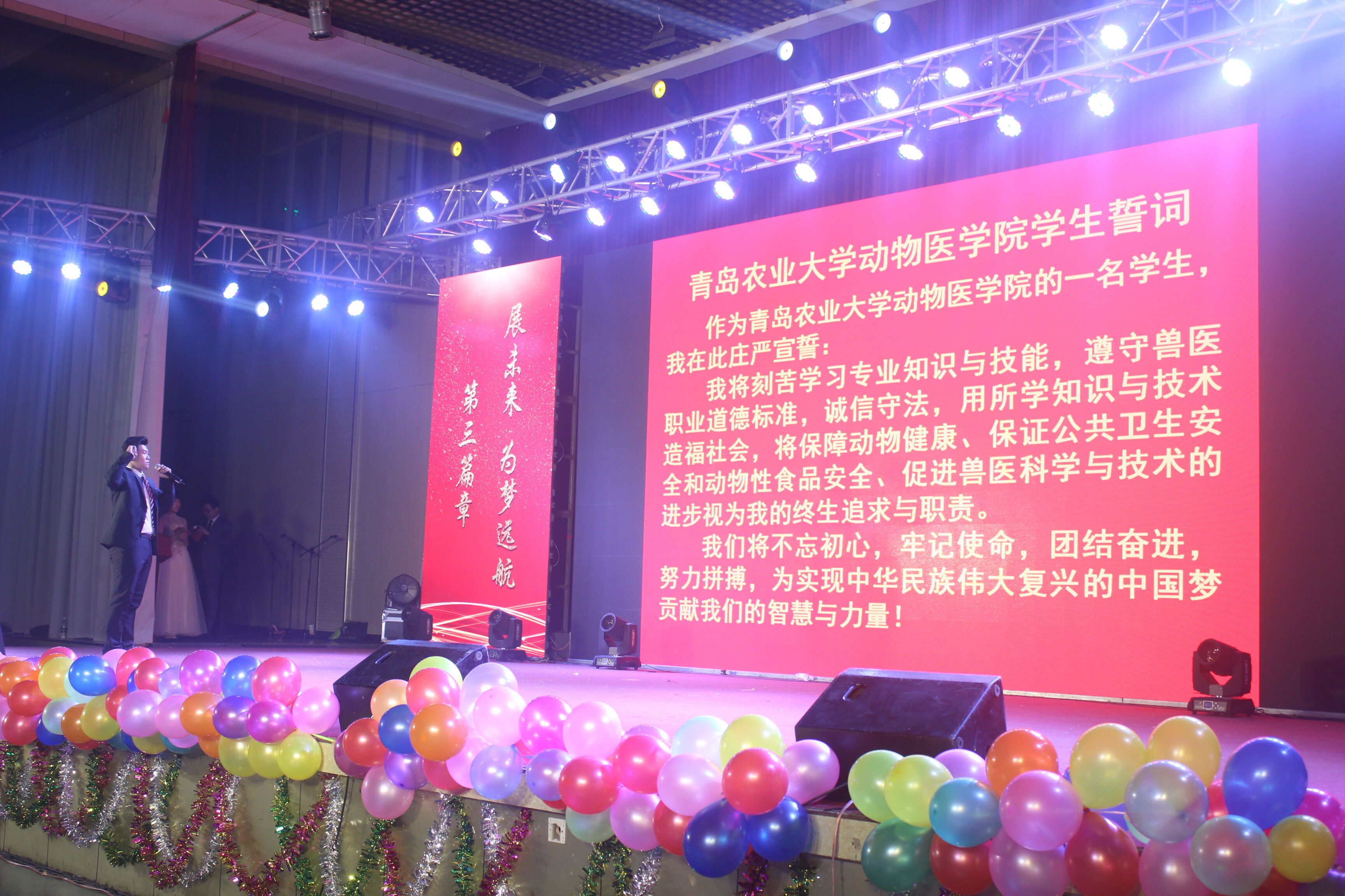 动物医学院全体教师上台宣誓,简单的誓词中透露出的是不变的决心。他们始终把立德树人作为自身的根本追求,坚持以德立身、以德立学、以德施教、以德育德,努力做党和人民满意的“四有”好老师。动物医学院学生会主席王俊博带领全体动医学子庄严宣誓,以专业知识和技能的学习为基本要求,以为将来诚信服务行业和社会为追求和职责,不忘初心,牢记使命,团结奋进,努力拼搏,为学院发展和行业发展贡献力量,嘹亮的誓词彰显的是动医学子的坚定决心。