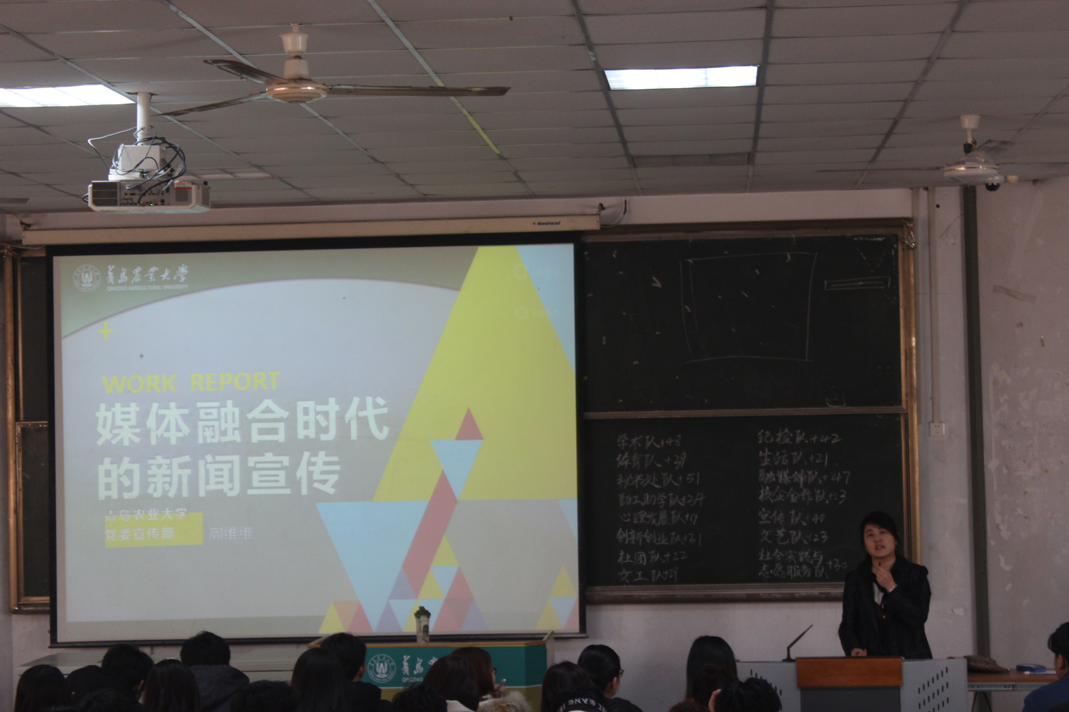 周维维为全体学生干部做了题为《媒体融合时代的新闻宣传》的报告,周老师以咪蒙公众号注销事件为切入点,引导广大学生干部要正确认识新媒体传播的几大特征,强调阅读量不等同于阅读质量,要提高信息的辨别力,要使新媒体成我们工作的助力,利用好新媒体融合时代的平台来生产传播信息,使我们的工作成果化、亮点化。