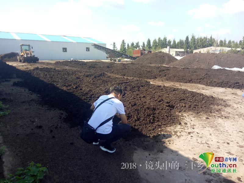 走进粪污晾晒场院,果真如郭老师所言,一个苍蝇都没有。粪污经过发酵后没有了刺鼻的味道,调研团指导教师韩先杰走进观察发现粪污里掺杂了秸秆等物质,经了解,加入秸秆是为了增加碳源,这样最后的成品——有机肥的肥力效果会大大增加。韩先杰老师向队员解释到,粪污里还添加了一些细菌,这样肥料撒入田地不会“烧苗”,也能保证土壤质量。中国青年网通讯员 王瑾 摄