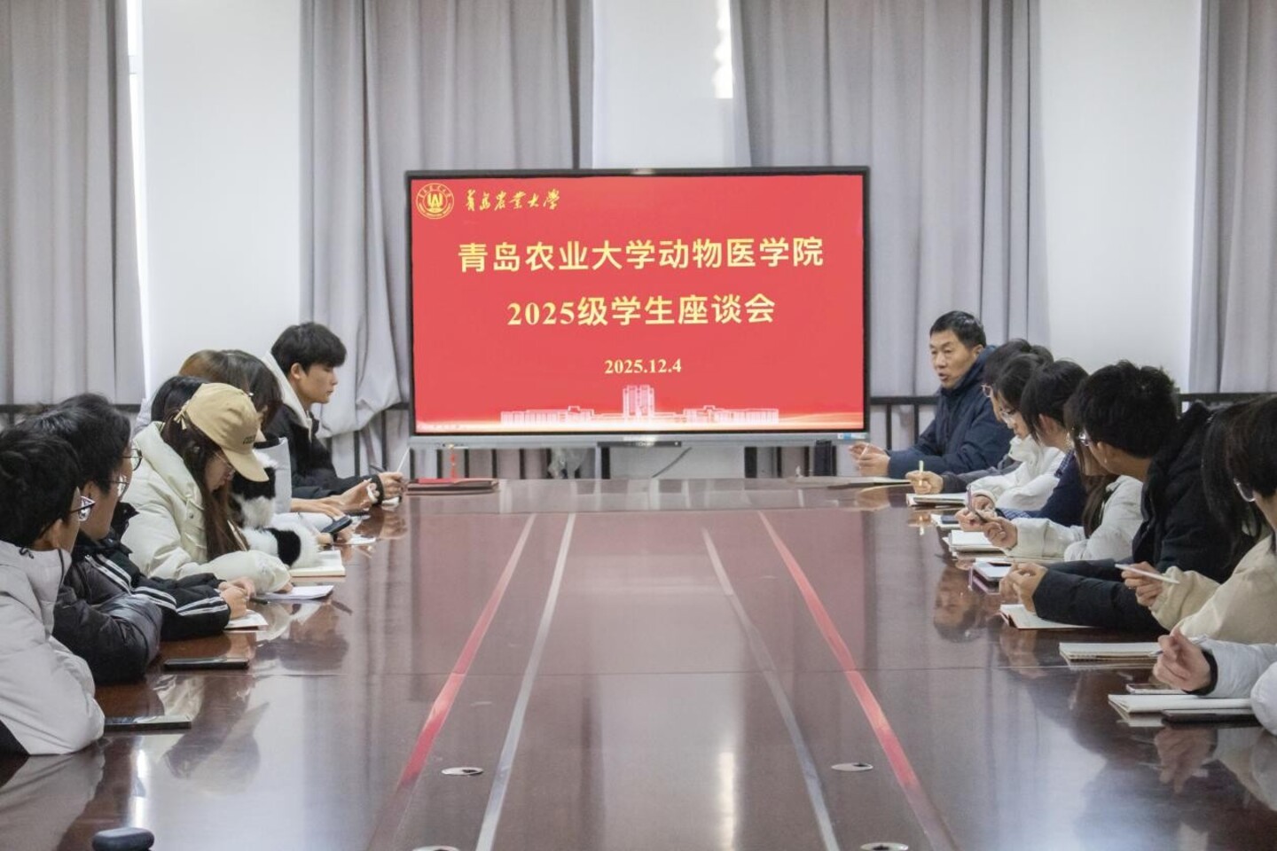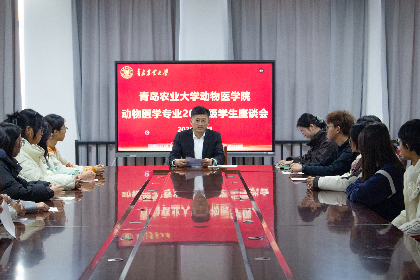 11月21日,学院在平度校区召开动物医学专业2025级学生座谈会。学院党委书记展学斌与动物医学专业2025级4班学生进行了座谈交流,深入了解学生入学后的学习生活状况。座谈会由辅导员闫书铭主持。班长和团支书分别汇报了班级情况,与会同学逐一发言,分享了入学以来的收获与体会。展学斌认真听取发言,并围绕同学们关心的学业适应、时间管理、专业认知等问题,与大家进行了交流。他鼓励同学们树立远大理想,将个人成长融入行业发展与国家需要,并对同学们提出三点希望:一是开阔格局视野,明确发展目标;二是聚焦学习主业,夯实专业基础;三是注重全面发展,促进身心健康。