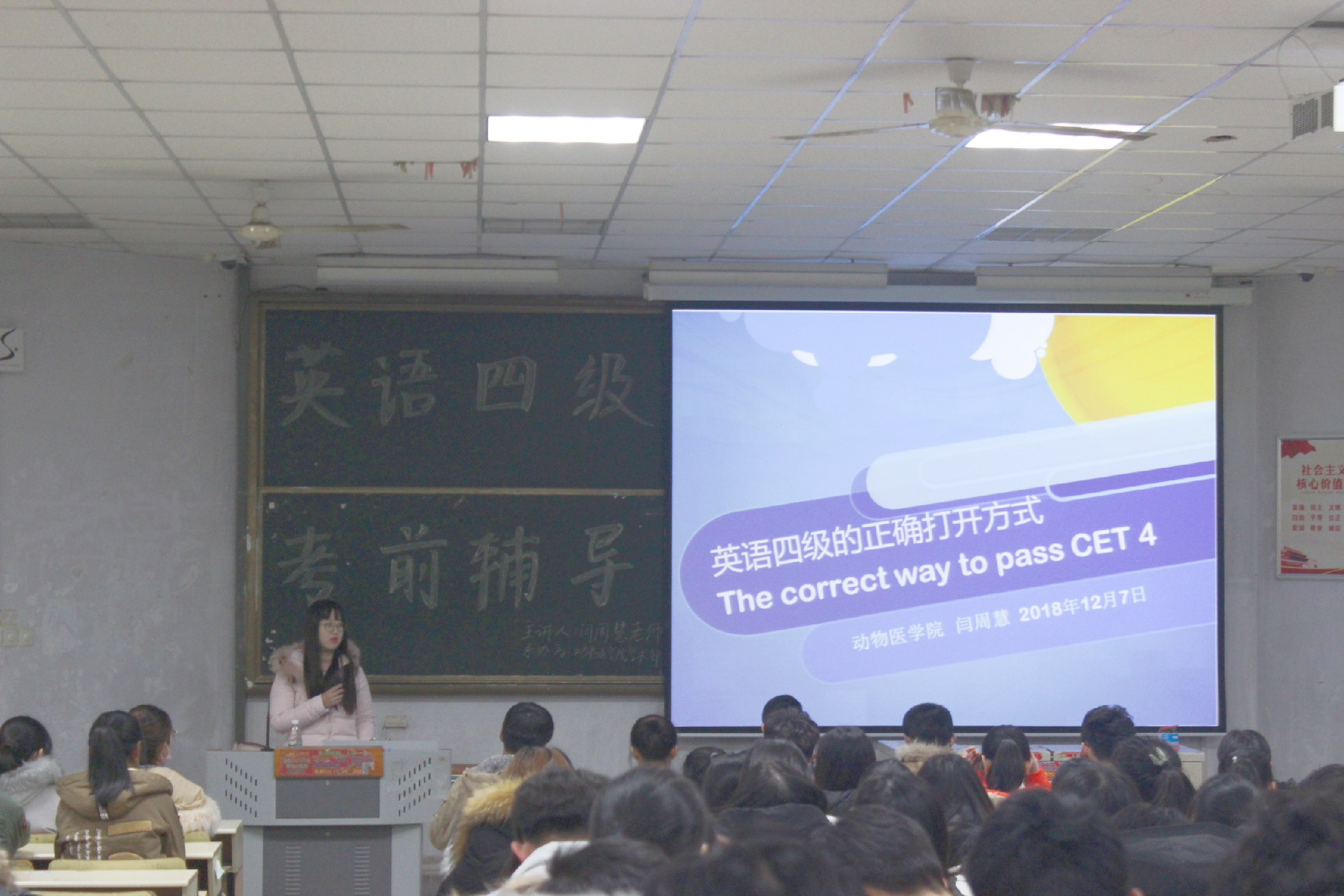 为进一步加强学风建设,提高四六级考试通过率。12月7日,青岛农业大学动物医学院在教学区举办英语四六级考前辅导讲座,此次讲座邀请到动物医学院副科级辅导员闫周慧担任主讲,2017级同学参加。