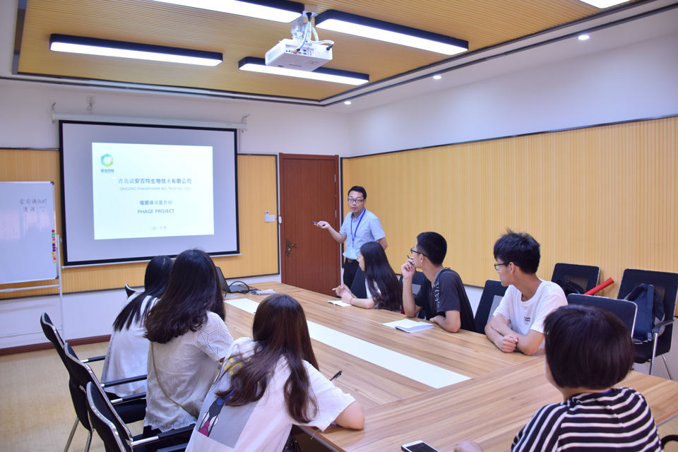 为了让队员们更加深入了解噬菌体的未来发展前景,公司研发部经理孙虎芝在会议室向队员们介绍了噬菌体治疗的优点和噬菌体作用机制,并向我们讲述了噬菌体治疗疾病的真实案例。实践队员们积极询问了解噬菌体使用现状。