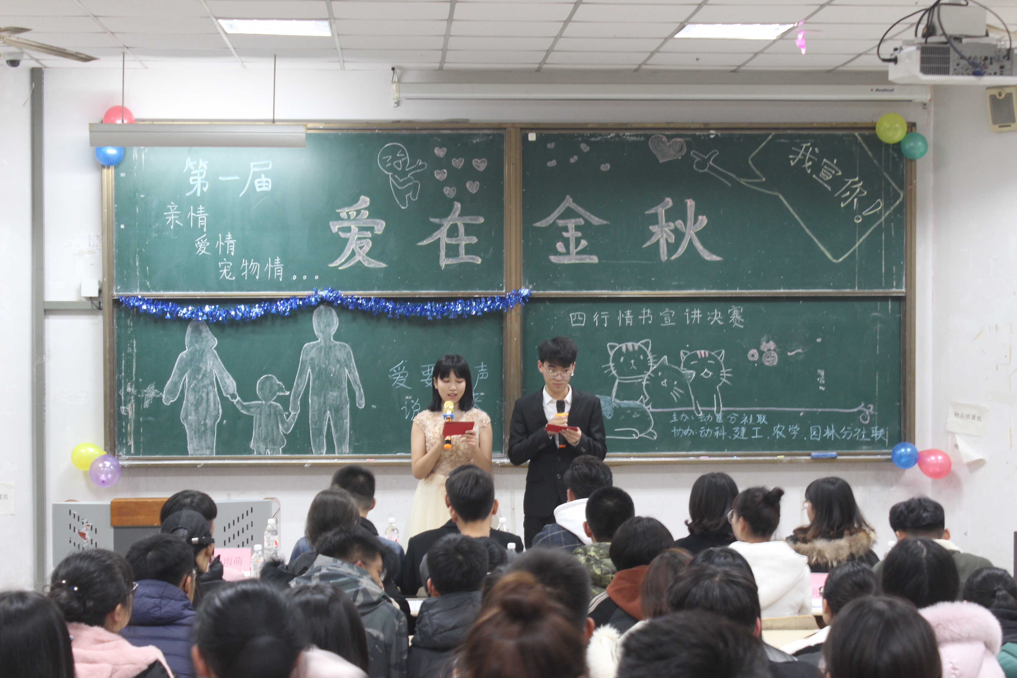 11月24日,由青岛农业大学动物医学院主办,动物科技学院、农学院、园林与林学院、建筑工程学院协办的第一届“爱在金秋”四行情书宣讲大赛在教学楼D举行,2018级同学积极参加。