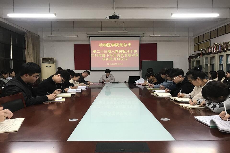 10月29日,动物医学院在生物楼举办第二十三期入党积极分子和2018年度下半年党员发展对象培训班开班仪式,会议由动物医学院第三党支部书记王传兴主持,动物医学院党总支书记孙运彩、第三党支部委员闫周慧、辅导员厉枝和新一期入党积极分子和党员发展对象全体参加。