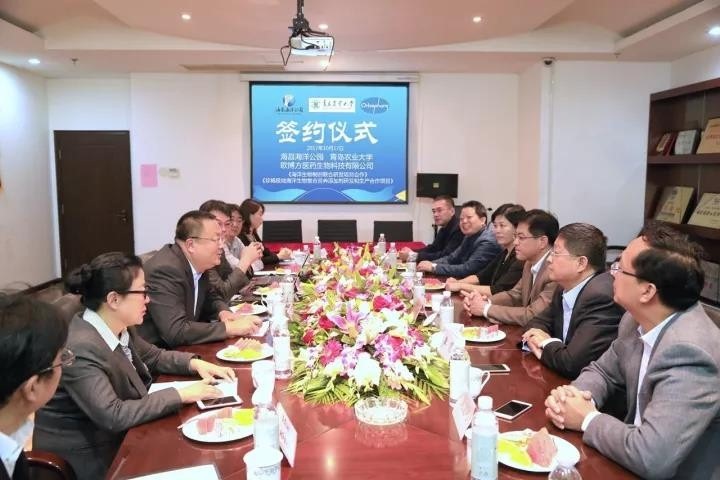 10月17日,青岛农业大学与海昌海洋公园进行“海洋生物制剂联合研发项目”合作签约,海昌海洋公园集团总裁谭广元、总经理阎宝成,青岛欧博方医药科技有限公司总经理盖瑾,青岛农业大学副校长杨同毅,科技处副处长赵龙刚,动物医学院院长单虎参加签约仪式。