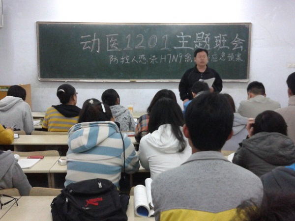4月15日晚,动医1201班在教学区举行了“防控人感染H7N9 ”的主题班会,班主任刘焕奇老师出席会议,班级所有同学参加会议。