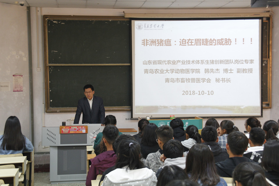 10月10日,青岛农业大学动物医学院举办“非洲猪瘟:迫在眉睫的威胁!”专题报告会,报告会由山东省现代农业产业技术体系生猪创新团队岗位专家、青岛市畜牧兽医学会秘书长、青岛农业大学动物医学院副院长韩先杰副教授主讲。动物医学院2018级全体同学,2016、2017级部分同学参加。