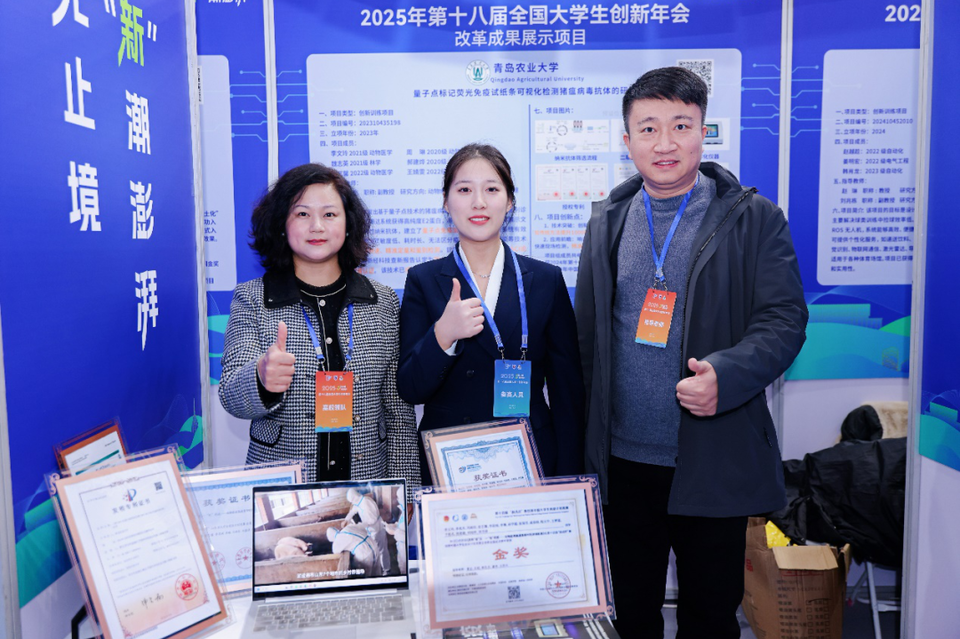11月21日至23日,由教育部指导、“国创计划”秘书处和南京大学共同主办的第十八届全国大学生创新年会在南京大学苏州校区圆满落幕。青岛农业大学动物医学院国家级大创项目《量子点标记荧光免疫试纸条检测猪瘟病毒抗体》成功入选“大学生创新创业改革成果项目”。