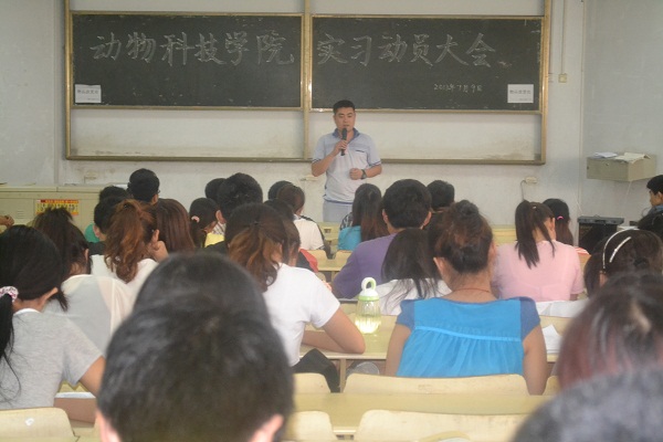 7月9日上午10点30分,动物科技学院在教学楼B101教室召开了动物科技学院实习动员大会。参加此次动员大会的有动物科技学院副院长、副书记白连万,分团委书记梁伟,教学秘书王光,辅导员王洋以及10级各班实习生。