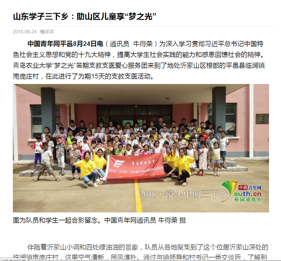 中国青年网平邑8月24日电(通讯员 牛得荣)为深入学习贯彻习近平总书记中国特色社会主义思想和党的十九大精神,提高大学生社会实践的能力和感恩回馈社会的精神。青岛农业大学“梦之光”暑期支教支医爱心服务团来到了地处沂蒙山区根部的平邑县临涧镇南庞庄村,在此进行了为期15天的支教支医活动。