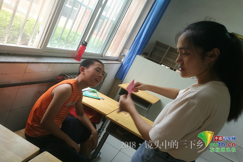 折纸课:志愿者在一对一教孩子们折千纸鹤。中国青年网通讯员 曹西月 摄