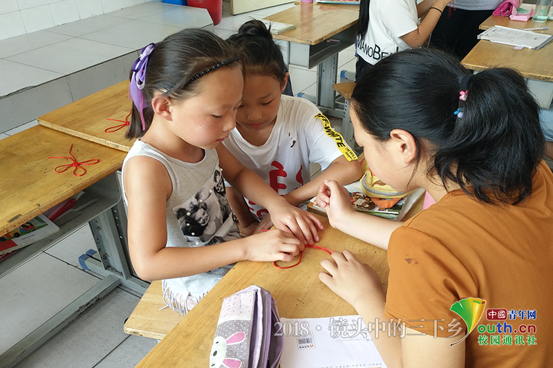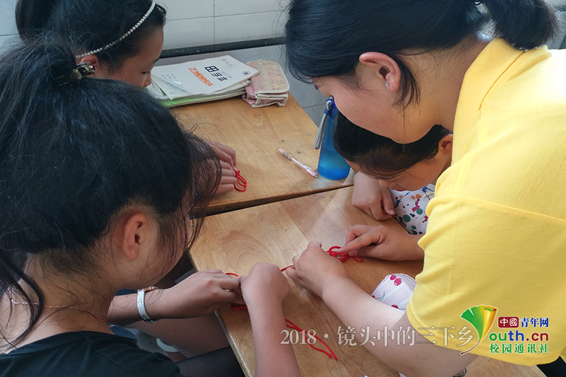 志愿者在给孩子们纠正错误,重新编织中国结。中国青年网通讯员 曹西月 摄
