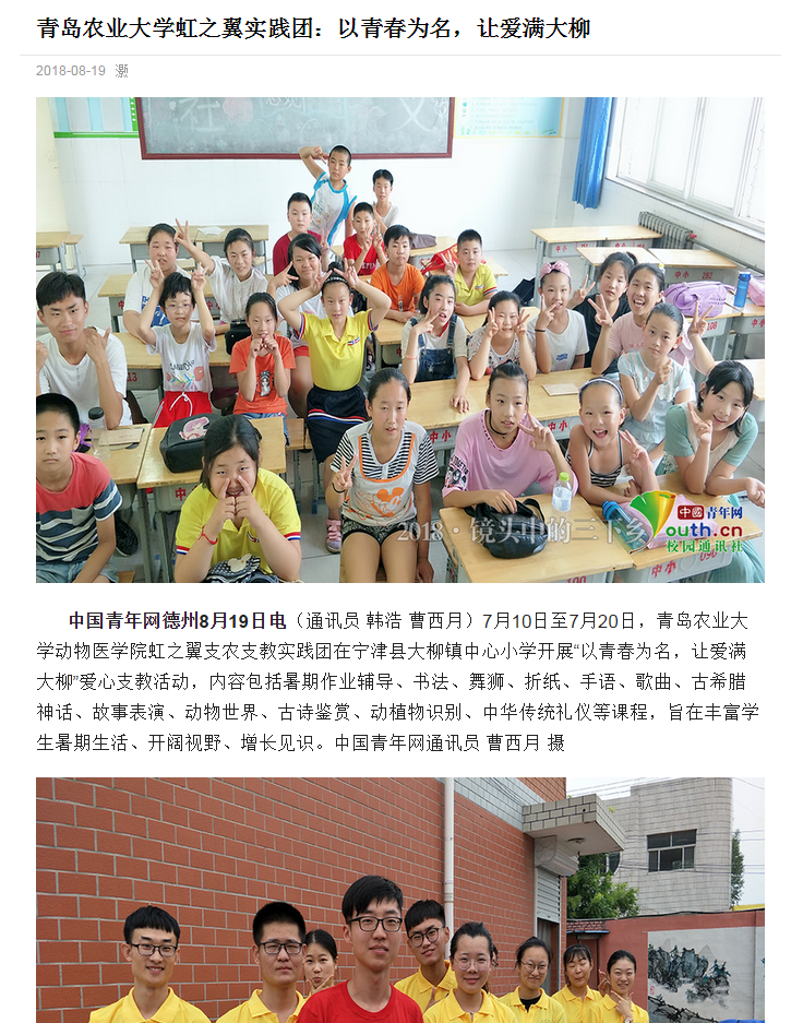 青岛农业大学虹之翼实践团:以青春为名,让爱满大柳(二)链接:https://xiaoyuan.cycnet.com.cn/s?uid=174357&app_version=1.0.8&sid=140376&time=1535272531&signature=KbD6x5nzGA2pvRerWXy4QoeORIQQQzaOg8LdMkQlPVqJYN0Bom&sign=a56fbb16f48a453c1763bbe561c647c8