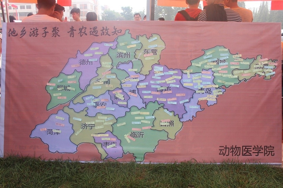 因动物医学院只面向山东省内招生,学院便制作了一个山东地图,让新生们将自己的联系方式粘贴在生源地城市的位置上,以此帮助来自同一城市的同学建立联系,增进友谊。
