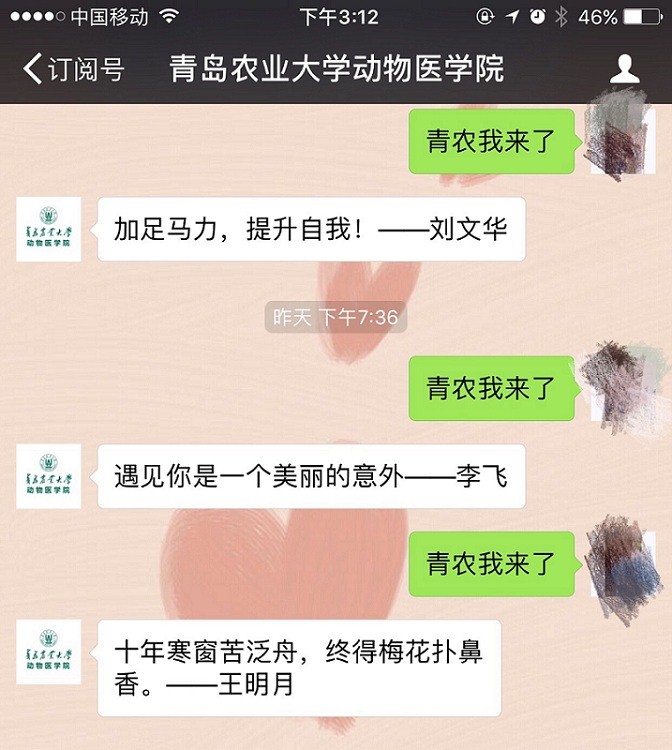 学院利用官方微信公众号发起留言活动,前期征集了来自学院师生的二十条新生寄语,只要新生在微信后台发送“青农我来了”或“动医我来了”,便会收到随机回复的新生寄语。